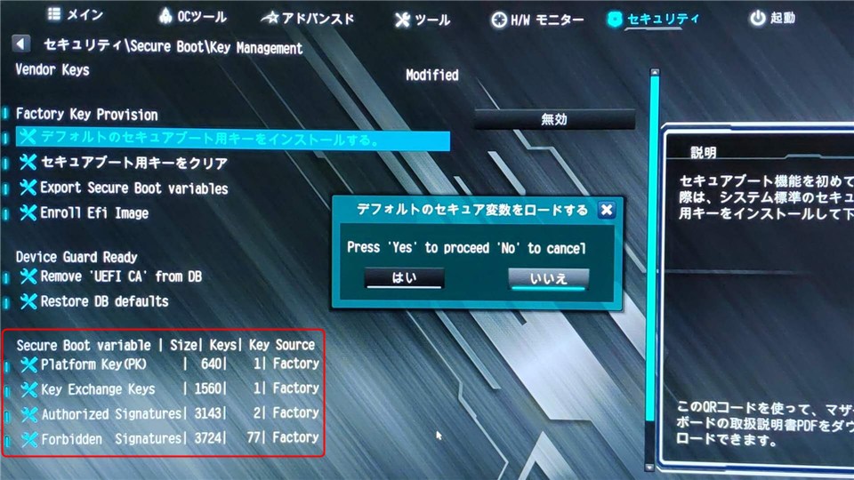 Once the Secure Boot keys are installed, the correct factory default keys (PK, KEK, db, dbx) will be displayed (in the red box at the bottom left of the image).