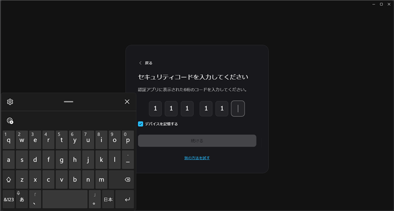 この方法で入力すると、セキュリティコード 1つを入力するたびに一瞬タッチキーボードが表示されてすぐ消えますが、正常に入力することできます。