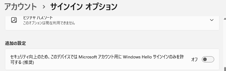 「設定」>「アカウント」>「サインイン オプション」で「セキュリティ向上のため、このデバイスでは Microsoft アカウント用に Windows Hello サインインのみを許可する (推奨)」をオフにしていても表示されない場合があるので、Microsoft アカウントのパスワードでログインしたいユーザーは「機能がなくなったのか?」と困惑してしまいますね。