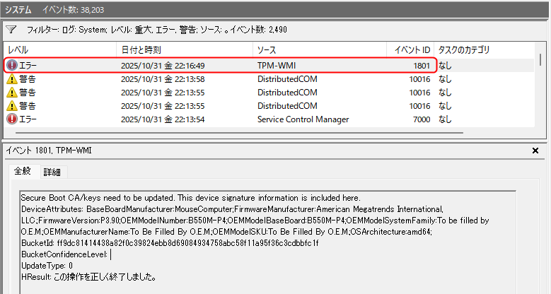 2025年10月のセキュリティ更新プログラムを適用して以降、PC のイベントビューアー(システムログ)に、以下のような「エラー イベントID 1801 (TPM-WMI)」が記録され、不安に思われている方が多いようです。