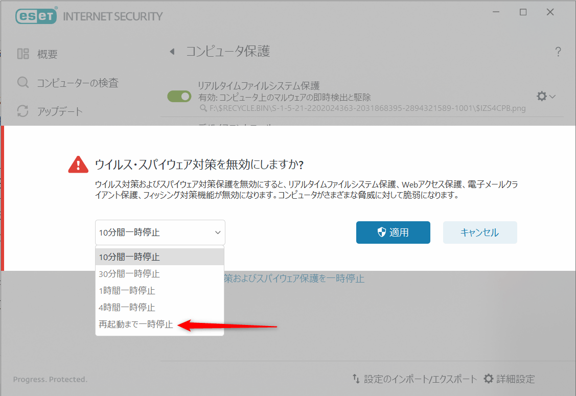 システムの復元を起動している場合は、閉じてからセキュリティソフトを一時停止し、再度システムの復元を開いてください。システムの復元の画面を開いたままセキュリティソフトを一時停止すると、復元が失敗することがあります。
