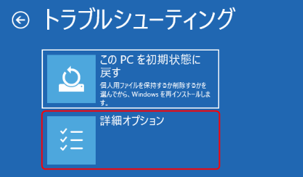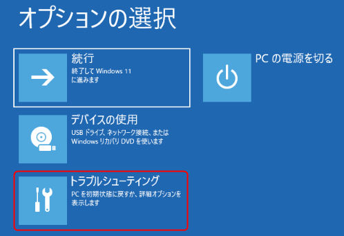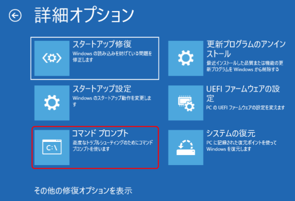 2.青い画面(回復環境)が出たら、「トラブルシューティング」>「詳細オプション」>「コマンド プロンプト」を開きます。