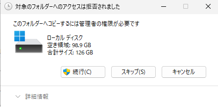 11.「対象のフォルダーへのアクセスは拒否されました」「このフォルダーへコピーするには管理者の権限が必要です」という警告画面が出たら、「続行」をクリックします。