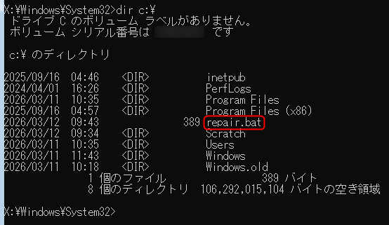 回復環境では「C」からズレることがあるためです。 dir C:\ (\は半角の円マーク¥)と入力て Enter を押し、「repair.bat」があればそこが Windows ドライブです。 ※もし「ファイルが見つかりません」と出た場合は、dir D:\ や dir E:\ と順番に入力して探してください。(ここでは仮に Cドライブにあったとします)