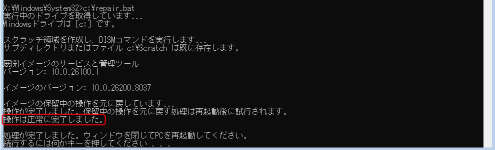 (※このコードは、ズレてしまった Windows ドライブを自動で探し出し、エラーを防ぐための作業領域を作った上で修復コマンドを実行するプログラムです)