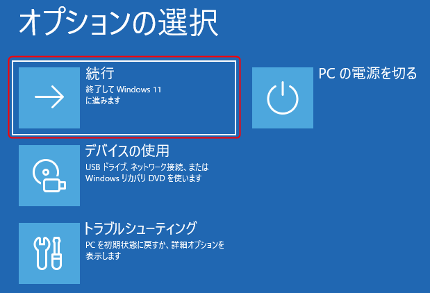 8.レジストリエディターとコマンドプロンプトを閉じると「オプションの選択」が表示されますので、「続行」を選択します。