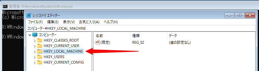 1.左側のツリーから HKEY_LOCAL_MACHINE をクリックして選択状態にします。