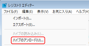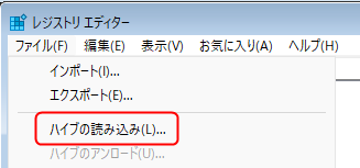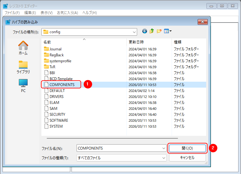 3.メニューの「ファイル」>「ハイブの読み込み」をクリックし、C:\Windows\System32\config\COMPONENTS を開きます。