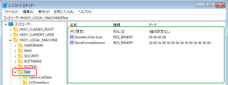 6.HKEY_LOCAL_MACHINE\Testを選択した状態で、メニューの「ファイル」>「ハイブのアンロード」をクリックして Test を閉じます。