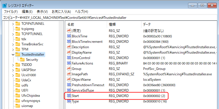 4.HKEY_LOCAL_MACHINE\Test\ControlSet001\Services\TrustedInstaller まで展開します。