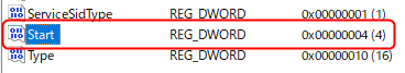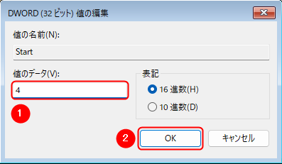 5.右側にある Start という値をダブルクリックし、値のデータを「4」(無効)に変更して OK を押します。