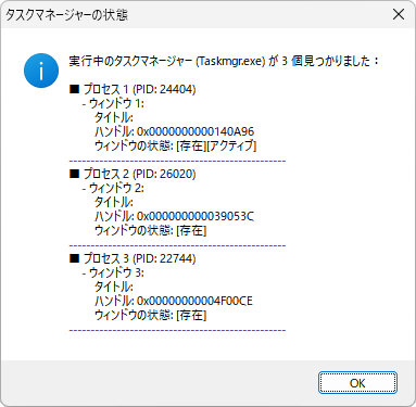 しかし、この状態で筆者が作成した検証プログラム(実行中の全「Taskmgr.exe」プロセスの状態を取得する AutoIt スクリプト)で確認してみたところ、驚くべき結果が確認されました。