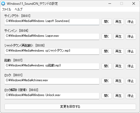 2023/12/02: 環境により設定ファイルへのアクセスが拒否されているのが原因で起動音、シャットダウン、サインイン、サインアウトの音を変更しても反映されない問題を修正しました。 具体的には、「WIndows11_SoundON_サウンドの設定」を管理者として実行するように変更しています。