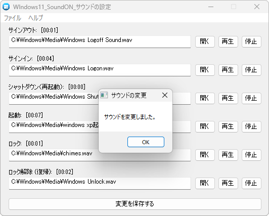 5.「サウンドを変更しました。」と表示されたら設定は完了です。OK をクリックし「WIndows11_SoundON_サウンドの設定」を終了してください。