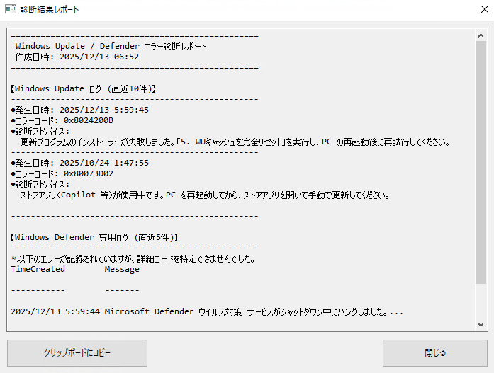 ① 独自機能:エラーの自動解析と日本語アドバイス システムログを自動で読み解き、直近の Update や Defender のエラーコード(0x…)の原因を特定。「Cドライブの空きを確保してください」「セキュリティソフトを一時停止してください」など、次にどう行動すべきかを具体的な日本語レポートでお知らせします。
